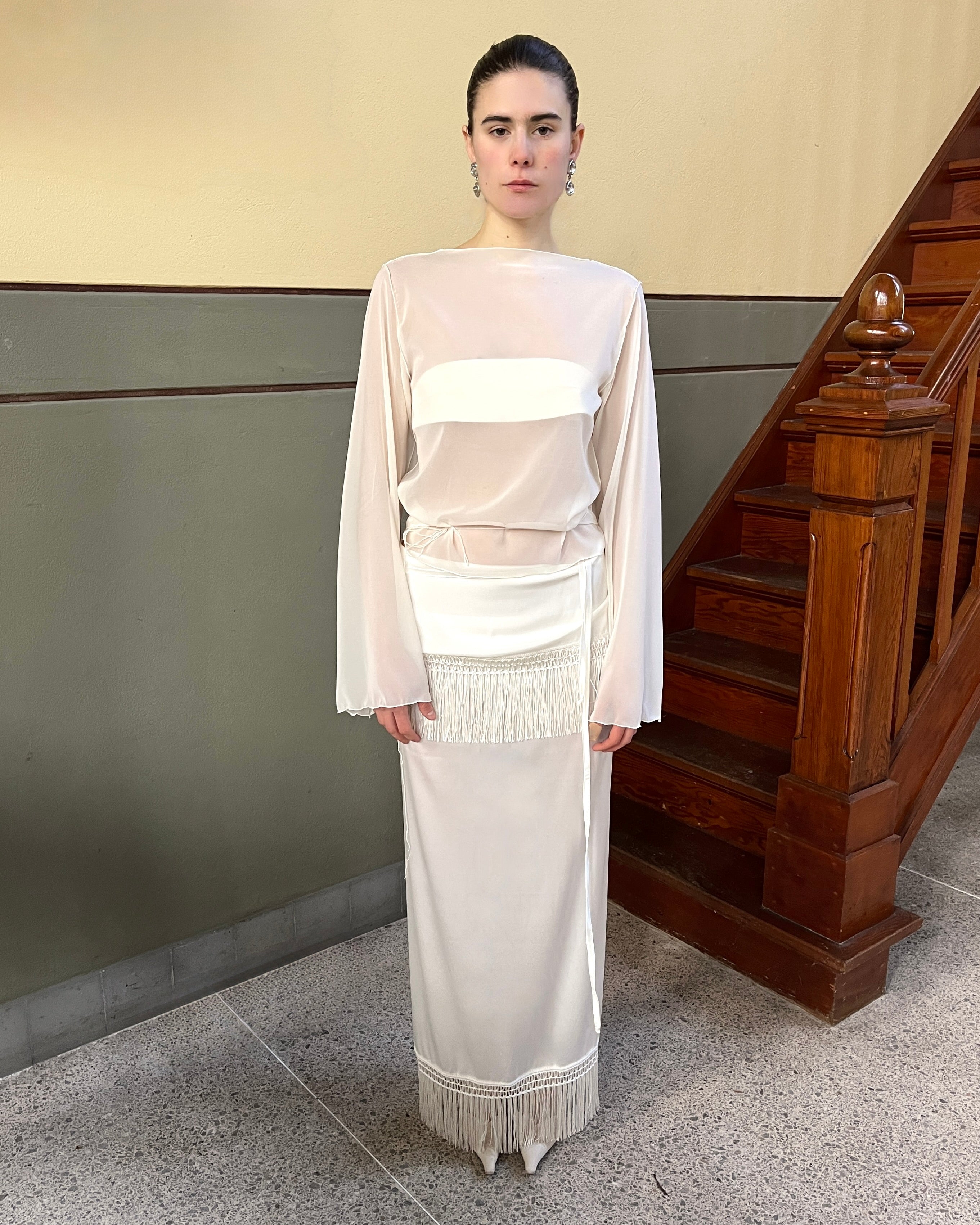 This 3/4 sleeve tee is made from soft, lightweight bamboo jersey, offering a breathable and comfortable feel against the skin. Designed with a boatneck neckline, it gently frames the collarbone while giving the piece a relaxed, elegant look. The easy drape and three-quarter sleeves create a simple, versatile silhouette with a smooth and natural feel.