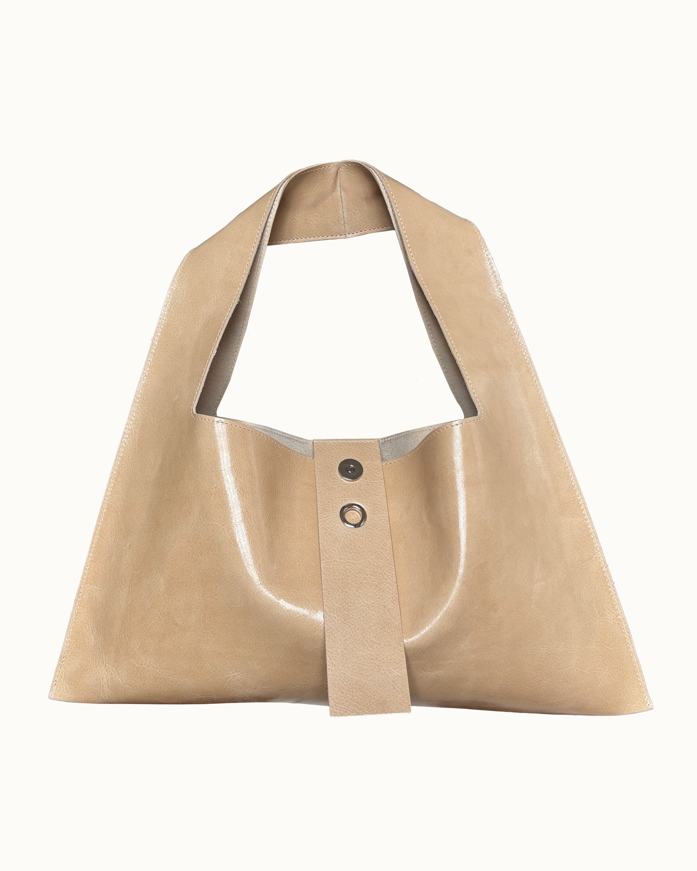 The bag consists of one piece of leather, devoid of lining. It closes with a magnet, and keys or accessories can be attached on the inside strap.